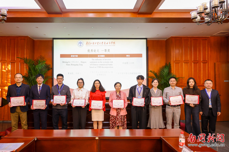 论文交流环节由经济学院副院长高洁主持。交流开始前,大会先对优秀论文作者进行表彰——从征集到的30篇论文中评选出10篇优秀论文,颁奖嘉宾为获奖代表颁发证书。表彰结束后,夏海霞、李淑一、周泳光、方泽凯、党雪、欧杰、吴锋、邓永亮等八位来自省内高校的获奖作者先后登台,结合自身研究方向分享核心成果。他们的研究紧密围绕广东经济发展与国内大循环需求,涵盖多类关键领域:既有广东外贸企业韧性提升、低空经济财政支持等产业政策议题,也包含数字化创新与收入不平等、人工智能金融应用等科技经济关联领域分析,还涉及Z世代消费潜力释放、数据资产信息披露等消费与企业发展维度研究,兼具学术深度与实践针对性,引发现场广泛关注。