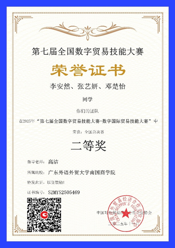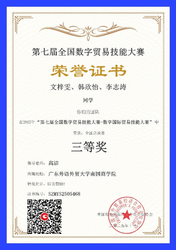 本次大赛以“数字赋能贸易,技能引领未来”为核心主题,是国内数字贸易领域颇具权威性与影响力的国家级协会赛事。赛事深度践行一体化教学理念,通过“以赛融学、以赛优教、以赛促改”的模式,着力锤炼学生的团队协同创新力、跨场景沟通力与专业岗位实操力,为数字贸易背景下相关专业的教育教学革新探索了全新路径。在本次大赛本科组的激烈角逐中,我院学子凭借扎实的专业功底与出色的临场发挥脱颖而出,最终4支队伍获奖,生动彰显了我院的办学底蕴与人才培育质量。这份成绩的背后,既是参赛团队默契协作的成果,更是经济学院多年来“赛教融合、以赛促学”培养体系的鲜活实践。(文/外贸商务学会 欧逸儿)