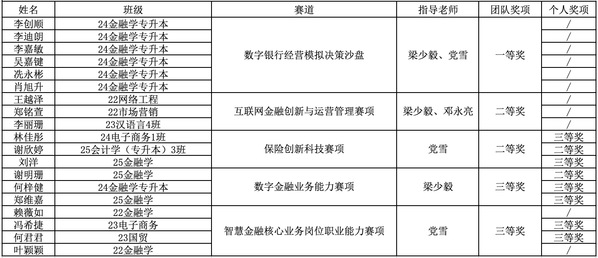 梁少毅老师和党雪老师指导的学生团队(24级金融学专升本李创顺、李迪朗、李嘉敏、吴嘉键、冼永彬、肖旭升)在数字银行模拟经营沙盘赛项中荣获第二名,获得团队一等奖。党雪老师指导的三人团队(24电子商务林佳彤、25会计专升本谢欣婷、25金融学刘洋)在保险创新科技赛项中获得团队二等奖,同时谢同学获得个人二等奖,刘同学和林同学分别荣获个人三等奖。梁少毅和邓永亮老师和指导的团队(22级市场营销郑铭萱、22级网络工程王越泽、23级汉语言李丽珊)在互联网金融创新与运营管理赛项中获得团队二等奖。党雪老师指导的团队(22金融学赖薇如、23电子商务冯希捷、23国贸何君君、22金融学叶颖颖)在智慧金融核心业务赛项荣获团队三等奖。其中,冯同学和何同学获得个人三等奖。梁少毅老师指导的团队(25金融学谢明珊、郑维嘉、24金融学专升本何梓健)在数字金融业务能力赛项获得团队三等奖,其中何同学获得个人二等奖,谢同学和郑同学获得个人三等奖。