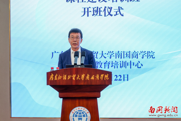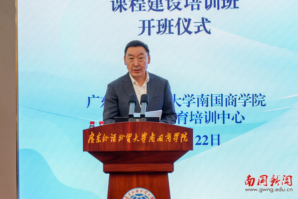 中国高等教育学会副会长、中国高等教育培训中心主任姜恩来在致辞中,对培训班的举办表示祝贺并向参会人员致以欢迎。他指出,我国高等教育正迈向高质量发展关键阶段,国家相关规划与政策为应用型高校发展指明方向,南国商学院立足地方性、应用型、国际化办学定位,以课程建设为切入点推进高质量发展,此次培训的举办正当其时、意义深远。同时,他从行业发展层面对学校产教融合与AI课程建设工作分享指导思路,强调要瞄准产业需求重构课程体系,依托AI赋能改造人才培养方案;坚持能力导向创新教学模式,构建“师、生、机”三元一体未来课堂;健全以产业需求为导向的多元协同评价体系,加大实践与创新能力评价权重;强化制度保障,构建校企协同育人新生态,推动课程共建、师资共育。他希望参训人员以此次培训为契机,深耕学习、学以致用,以实干助力学校高质量发展,为粤港澳大湾区人才培养、教育强国建设贡献力量。
