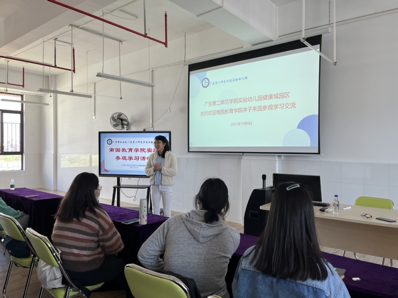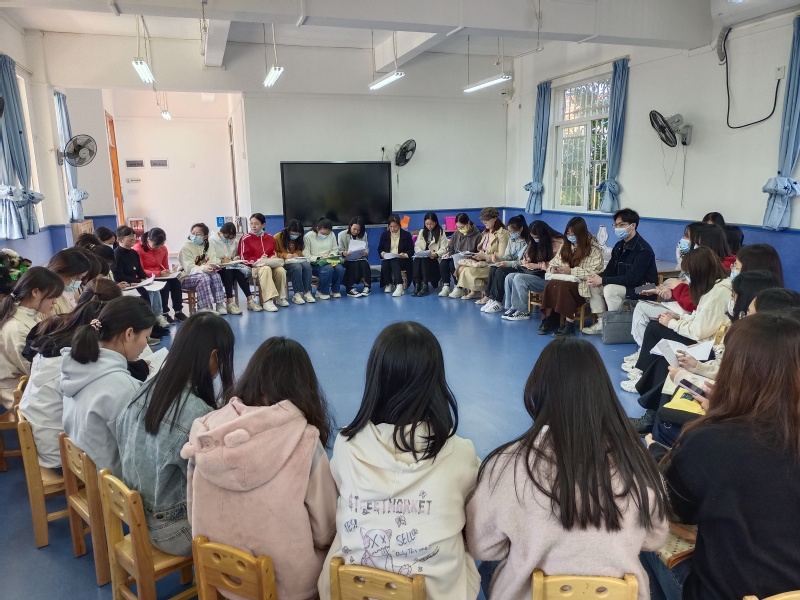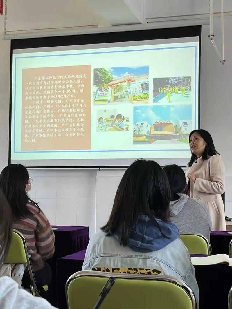 值得一提的是,在广东第二师范大学实验幼儿园教育活动课程观摩后,曾副园长面向全体师生进行了主题为“安吉游戏在广二师”的讲座,并耐心解答了同学们的疑问,整体气氛愉快活跃。在白云区良田第一幼儿园参观的同学在旁听公开课之后与该幼儿园教师共聚一堂进行了课程复盘,对教师生动活泼的授课表示感谢,同时针对公开课提出了个人的感受与想法,气氛和谐活泼。