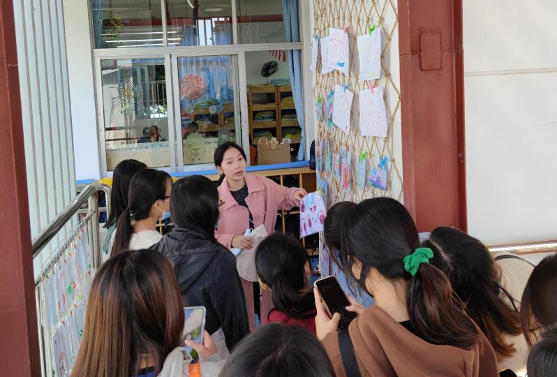 在幼儿园老师们的引领和带组老师的陪同下,同学们分组对幼儿园进行参观。在参观的过程中,同学们不时驻足,与带组老师进行交流、询问,用手机拍照记录下精彩画面和优美的校园环境,也对各幼儿园内规范的管理、优美舒适的教育环境、充满创意的功能活动室、丰富的区域游戏、快乐的课间户外活动以及礼貌问好的小朋友们表示欣赏与赞叹。