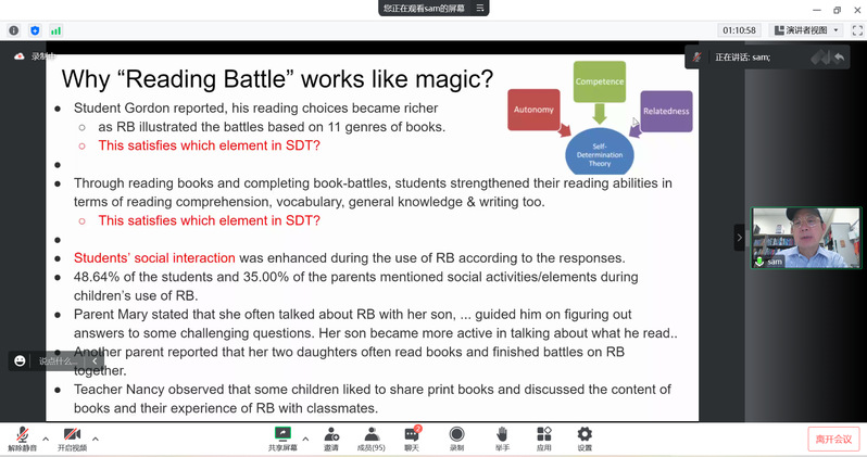 紧接着,朱启华教授指出了Reading Battle对儿童发展起到的重要作用。为了让学生对其作用有更深入的理解,朱教授以小男孩的故事为例,阐明了Reading Battle平台对于改变与提升自己综合能力的必要性,并强调学生最好的学习方式为自主学习,鼓励学生学会学习,不断促进自身基本素质的发展。