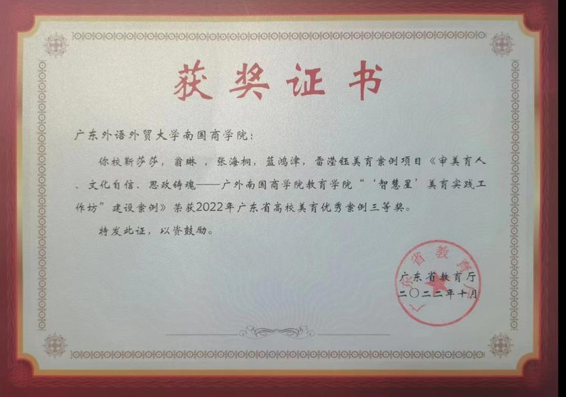 近日,广东省高校美育优秀案例评选活动落下帷幕。我校教育学院靳莎莎副教授、翁琳副教授和教育学院学生蓝鸿津、雷滢钰、张海桐同学共同合作的项目作品《审美育人、文化自信、思政铸魂——广外南国商学院教育学院“‘智慧星’美育实践工作坊”建设案例》荣获广东省高校美育优秀案例三等奖。