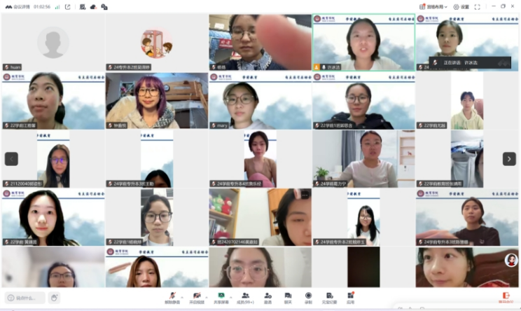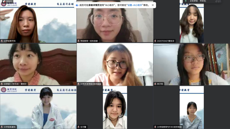 为切实做好本学期自主实习工作,帮助同学们明确实习任务、把握关键要求。2026年2月28日晚,教育学院学前教育系在线上召开本学期自主实习启动会,22级学前教育师范生及24级学前教育专升本全体同学参会。会议由学前教育系主任许冰洁老师主持,教育学院副院长翁琳副教授、系副主任陈智秀老师共同出席,为即将踏上实习岗位的同学们明确任务、强调要求、送上寄语。