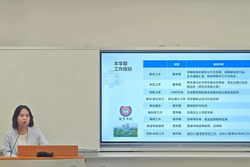 最后,许冰洁主任详细解读了新学期工作计划。教学方面,将严查迟到早退,整顿课堂纪律,并开展教学材料评优活动,鼓励教学可视化成果产出。班导师工作方面,调整部分毕业班班导师,要求首次班会重点强调实习就业填报,并关注学生个性化情况。毕业论文指导需给予学生具体有效的反馈,帮助学生真正提升。四六级报名已启动,分配指导教师督学打卡;今年考研过线人数可观,系部将组织面试辅导,助力学子升学。此外,国际交流项目与艺术课程建设也将同步推进,为学生拓宽发展路径。