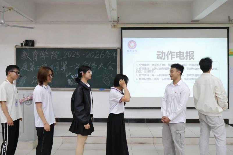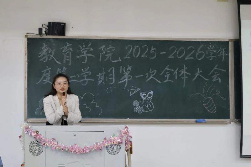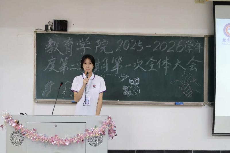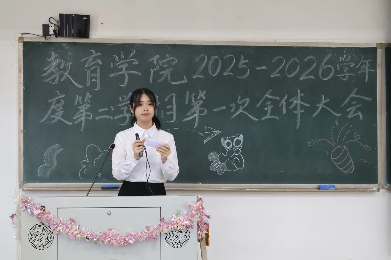 初心如炬,万象更新。教育学院团学于2026年3月12日14:30在G403教室顺利召开第二学期第一次全体大会。主持人欧恩佟为大会致开幕词,依次介绍出席本次大会的有教育学院党总支书记梁立为书记、团学指导老师罗璇老师、主席团成员及各部门负责人,并向到场的各位老师与同学们致以诚挚的感谢和热烈的欢迎。