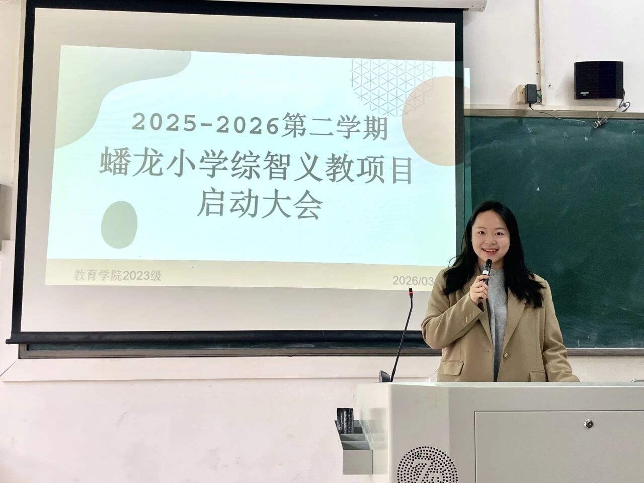 2026年3月4日,蟠龙小学第七期综智教学项目启动大会于B102如期举行。本次启动大会由马若芊老师主持,教育学院肖建芳教授、王淑杰教授以及赵芸老师共同出席,与小学教育专业23级赴蟠龙小学开展综智双语项目的同学们齐聚一堂,明确新学期教学要求,凝聚实践共识,为新学期双语教学实践工作拉开序幕。