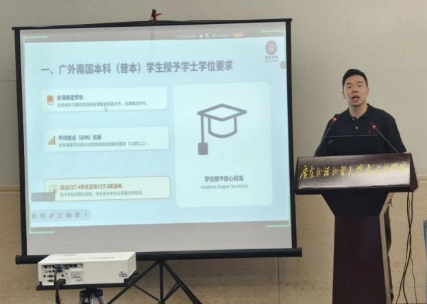 魏迅鸿院长助理围绕英语水平等级考试、开学第一课及教务工作提出要求:精准摸排四六级未通过学生并开展针对性辅导,重点关注实习学生英语学习;开课需备齐教学 “四件套”,同课头教师统一教学标准;本学期优化统一教学大纲,规范学院调课流程,感谢教师对行政工作的支持。