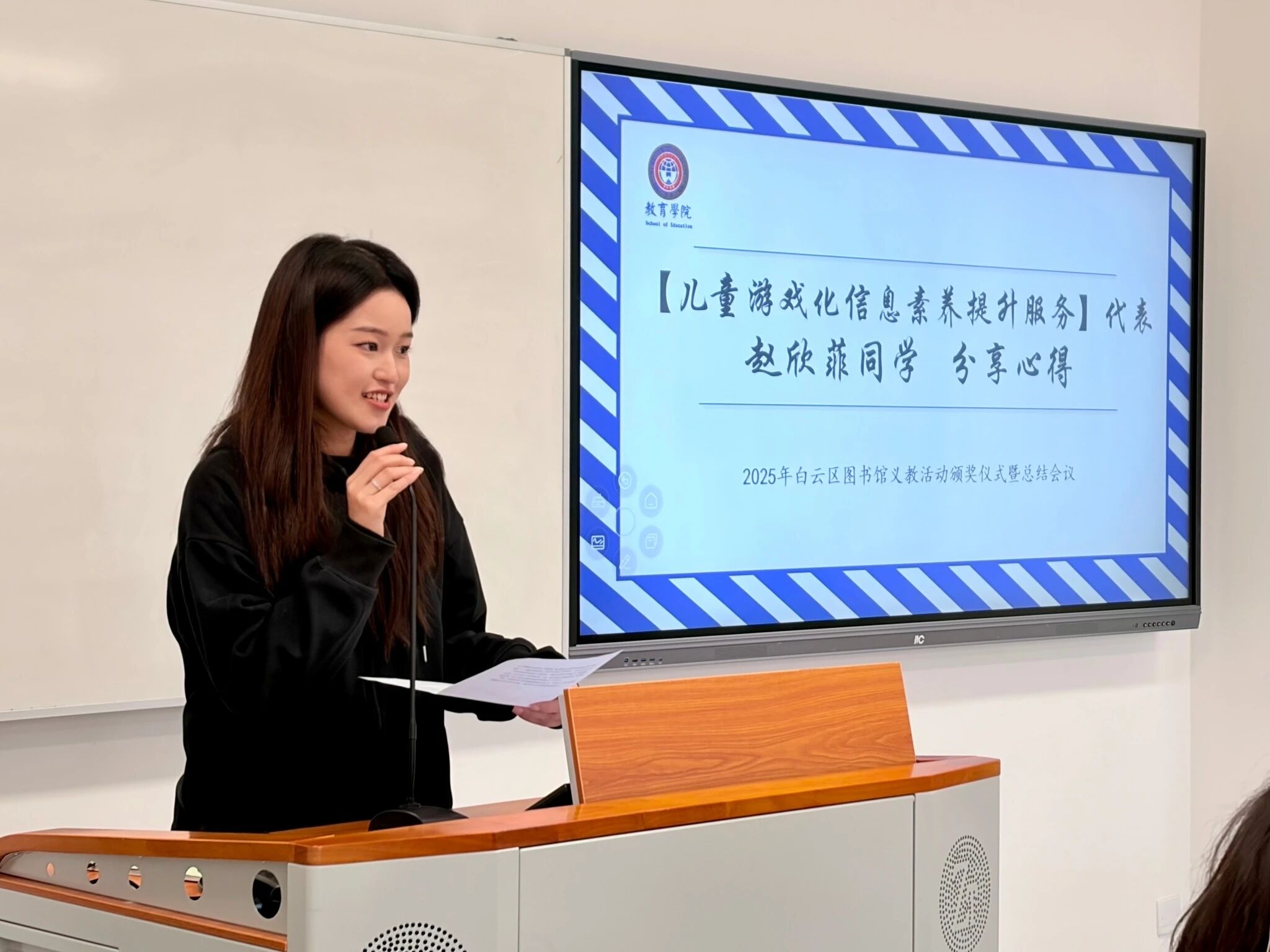 在心得分享环节,非遗多民族文化系列活动代表阳悉妮同学与儿童游戏化信息素养提升服务活动代表赵欣菲同学先后分享了各自的感悟与收获。
