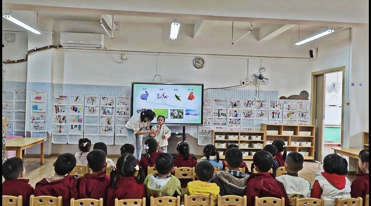 “小朋友们还记得昨天我们一起当森林小侦探的经历吗?今天森林里的小动物要开舞会,但老虎突然来了,它们都藏起来啦!”老师的话音刚落,孩子们的好奇心瞬间被点燃。随着青蛙、蜥蜴、螳螂、竹节虫的图片逐一亮相,“寻找隐藏的小动物”游戏正式开始,孩子们睁大眼睛仔细观察,纷纷举手分享自己的发现。