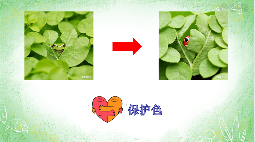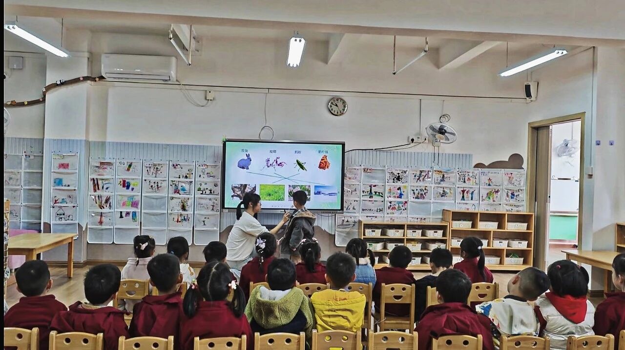 在李老师的引导下,孩子们通过对比青蛙与叶子的颜色,孩子们发现了动物保护色的秘密;观看竹节虫的视频后,又解锁了拟态的神奇:不仅要模仿颜色,还要模仿形状和行为。在 为雪兔、枯叶蝶选隐身地的互动中,孩子们积极运用学到的知识,说出雪兔是白色的,要躲在雪地里、枯叶蝶合起翅膀像枯叶,藏在树枝上最安全等充满逻辑的表达。