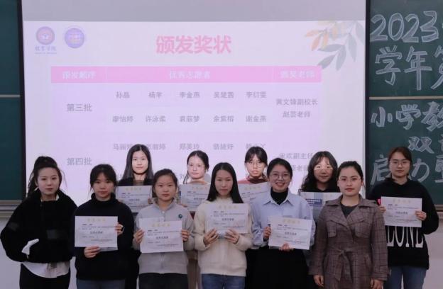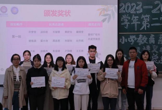 会议的第三部分,由两位志愿者代表发言。陈颖燕同学用“路漫漫吾志愈坚,上下求索苦亦甜”来开启她的活动分享,她分享了一年以前她在动员会上老师们给予的指导,而这也成为她义教活动的方向,由此她总结出备、教、思、创的四字体验。备课即做到先仿照,后创造;教学时进行全英式教学,将看听说读写做演唱融会贯通;思即反思自身教学行为,总结教学的得与失;创就是创设真实、丰富的语言教学环境,做到玩中学,学中玩,教学的有趣化。
