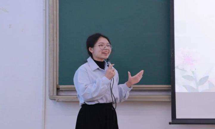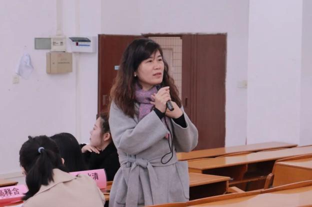 随后由马丽婷同学上台分享,她提出雕琢课堂,心系教学;创编故事,寓教于乐;聚沙成塔,厚积薄发三个方面,并从明确教学目标,紧扣教学主题;结合学生生活实际,巧妙构思故事情节;融合多元素,增强趣味性三大方面详细阐述如何进行创编故事。最后她向大家分享八字共勉:听课、模课、磨课、悟课。