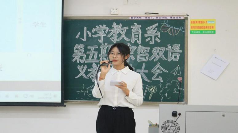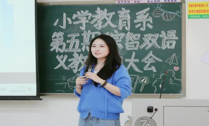 袁丽梦同学分享了自己参加综智义教活动的经历,表示在这段活动中收获许多,学会了如何用英语和小朋友相处、课堂管理等。她提到这是一个教学相长的过程,要善于发现问题再解决问题,也希望学弟学妹们勇敢迈出第一步,有付出并坚持就会有收获。