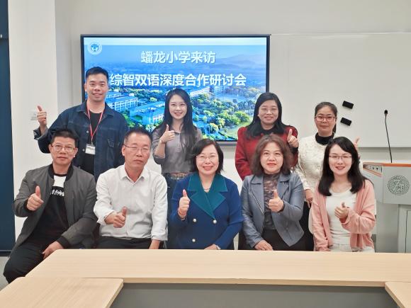 为深化教学合作、共破课堂难题,12月23日下午,蟠龙小学校长萧国标、副校长萧惠清、曾德亮率英语科组长范伟英及教师代表曾燕芬来访我校,与教育学院联合召开“综智双语深度合作交流研讨会”。双方聚焦教学实践、合作成效与未来规划,展开务实对话。会议由教育学院副院长肖建芳主持,副院长翁琳副教授、院长助理魏迅鸿、小学教育系副主任赵芸老师等共同参会。