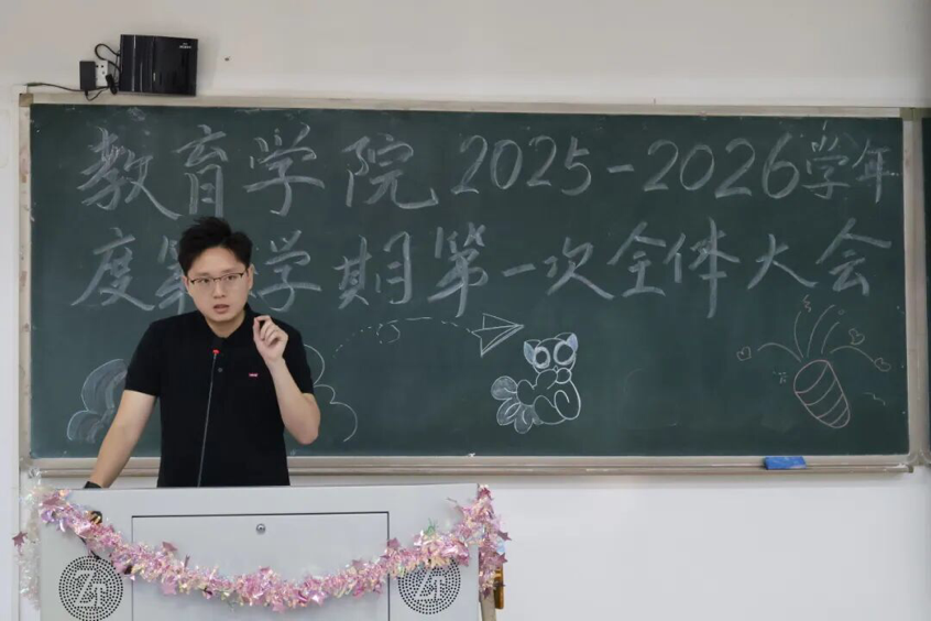 大会第一项议程,教育学院梁立为书记发言。梁立为书记结合教育学院团学工作实际与发展现状,向全体团学干部发表讲话,为后续工作开展指明方向。他首先对近期活动组织工作予以肯定,欣慰于活动筹备质量较以往有明显提升,重申活动的润色需建立在扎实的工作基础之上;同时着重强调学习的重要性,要求全体干部兼顾学业与工作,筑牢自身发展根基。随后,书记围绕团学工作开展提出多项核心要求:一是坚守工作初心,团委工作要坚持从严治团,以服务青年为本,做好桥梁纽带,凝聚青年力量、服务学院发展大局;二是树立品牌与创新意识,指出“无品牌则衰,无创新则竭”,指出部分工作存在墨守成规的问题,要求干部打破固有思维,在工作形式、内容上主动求新求变,以更高标准完成工作;三是围绕学院中心建功立业,针对学院专业赛事志愿活动提出学生参与积极性低等问题,强调随着学院规模扩大,团学工作需带动更多同学参与。最后,梁立为书记希望大家用心享受大学时光,在提升学业成绩的同时锤炼履职能力,以过硬的综合素质彰显教育学院学子的良好风貌,扛起传承学院荣光的责任。