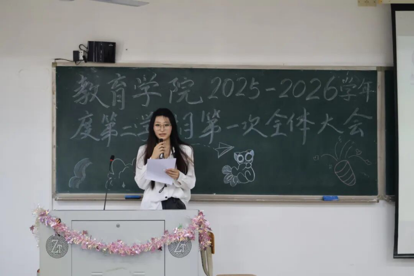 初心如炬,万象更新。教育学院团学于2026年3月12日14:30在G403教室顺利召开第二学期第一次全体大会。主持人欧恩佟为大会致开幕词,依次介绍出席本次大会的有教育学院党总支书记梁立为书记、团学指导老师罗璇老师、主席团成员及各部门负责人,并向到场的各位老师与同学们致以诚挚的感谢和热烈的欢迎。