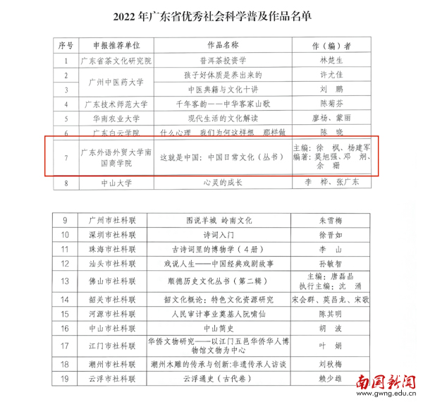近日,广东省社会科学界联合会下发通知,表彰2022年广东省优秀社会科学普及专家、工作者、作品、基地和社会科学普及工作先进单位,由我校徐枫教授等主编的《这就是中国:中国日常文化》(丛书)获评“2022年广东省优秀社会科学普及作品”。全省共有19件作品获评该奖项,其中仅2件为民办院校推荐申报,我校为其中之一。