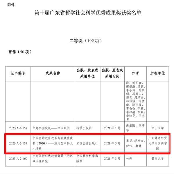 本网讯 近日,根据广东省人民政府关于颁发第广东省哲学社会科学优秀成果奖的通报》(粤府函〔202472号),校执行校长王华教授团队著作中国会计教育改革与发展蓝皮书(2020)——应用型本科人才培养》获著作类等奖。这是我校首次荣获广东省哲学社会科学优秀成果奖也是我校政府科研成果奖的历史性突破