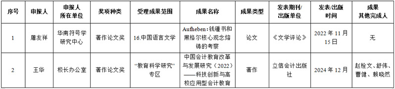 根据《教育部办公厅关于第十届教育部科学研究优秀成果奖(人文社会科学)申报工作的通知》(教社科厅函〔2025〕12号)及广东省教育厅《广东省教育厅转发教育部办公厅关于第十届高等学校科学研究优秀成果奖(人文社会科学)申报工作的通知》要求,经个人申报、科研处形式审查及校学术委员会审议,现将我校拟推荐参评的两项成果予以公示。公示时间为2025年11月5日至2025年11月11日。