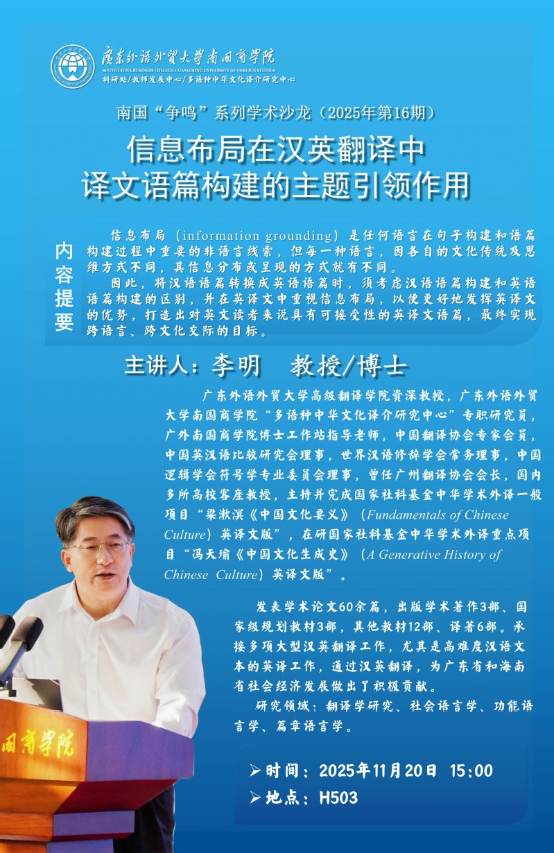 本校定于2025年11月20日15:00教学楼H栋505举办南国“争鸣”学术沙龙(2025年第16期)信息布局在汉英翻译中译文语篇构建的主题引领作用。