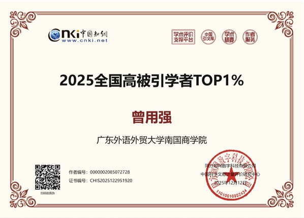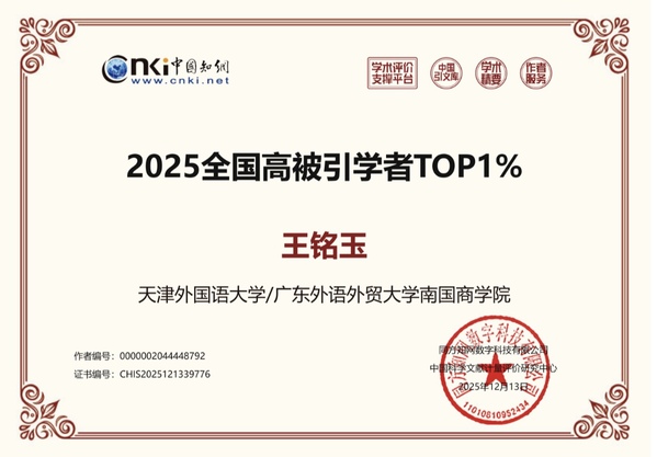 我校副校长、华南符号学研究中心主任王铭玉教授入选外国语言文学领域2025全国高被引学者TOP1%。副校长曾用强教授入选外国语言文学领域全国高被引学者TOP1%。原我校经济学院退休教授李剑英获税务领域2025高被引学者Top5%。