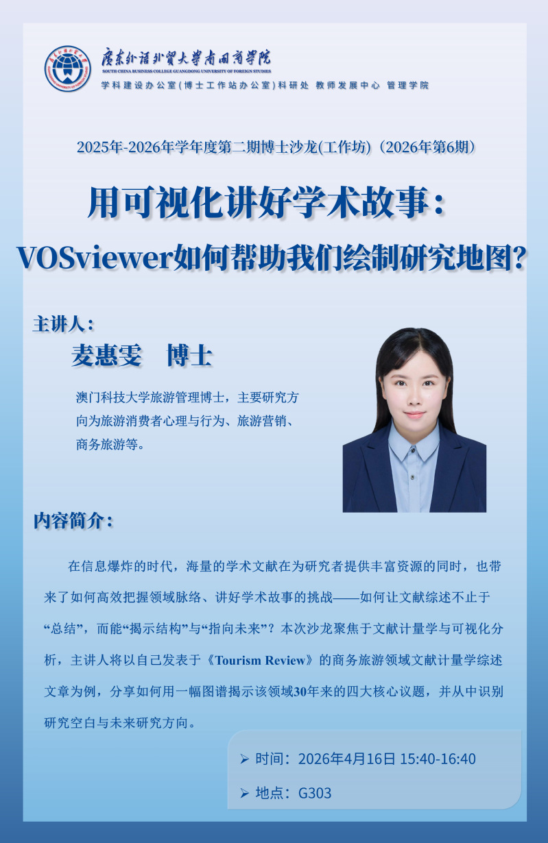 内容简介:在信息爆炸的时代,海量的学术文献在为研究者提供丰富资源的同时,也带来了如何高效把握领域脉络、讲好学术故事的挑战——如何让文献综述不止于“总结”,而能“揭示结构”与“指向未来”?本次沙龙聚焦于文献计量学与可视化分析,主讲人将以自己发表于《Tourism Review》的商务旅游领域文献计量学综述文章为例,分享如何用一幅图谱揭示该领域30年来的四大核心议题,并从中识别研究空白与未来研究方向。可视化分析软件VOSviewer将作为核心分析工具在本次沙龙中进行重点讲解,通过系统拆解从数据导入、参数设置到图谱生成的全流程,助力师生掌握绘制高质量研究地图的关键技术,从而为学术写作与创新提供坚实的实证依据与技术支撑。