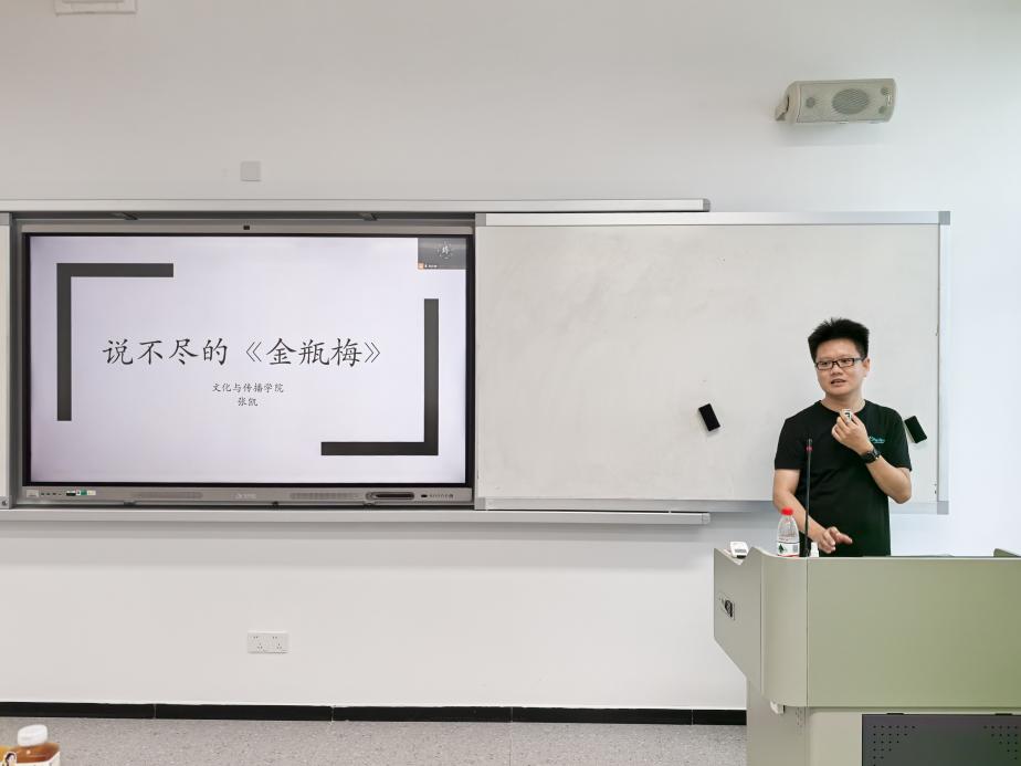 9月18日下午,由图书馆主办的“师生共读经典”系列活动第二期于教学楼H803顺利开展,现场座无虚席,气氛热烈。本次活动特邀文化与传播学院张凯老师担任领读人,以“说不尽的《金瓶梅》”为题,从学术、文本与社会三个维度,引领在场师生一同解读这部在中国文学史上极具文学与社会价值却又屡遭争议的经典作品。活动开始前,图书馆已收到来自同学们的40份读书心得与思维导图,充分展现大家对《金瓶梅》一书的预先研读和积极参与的热情。