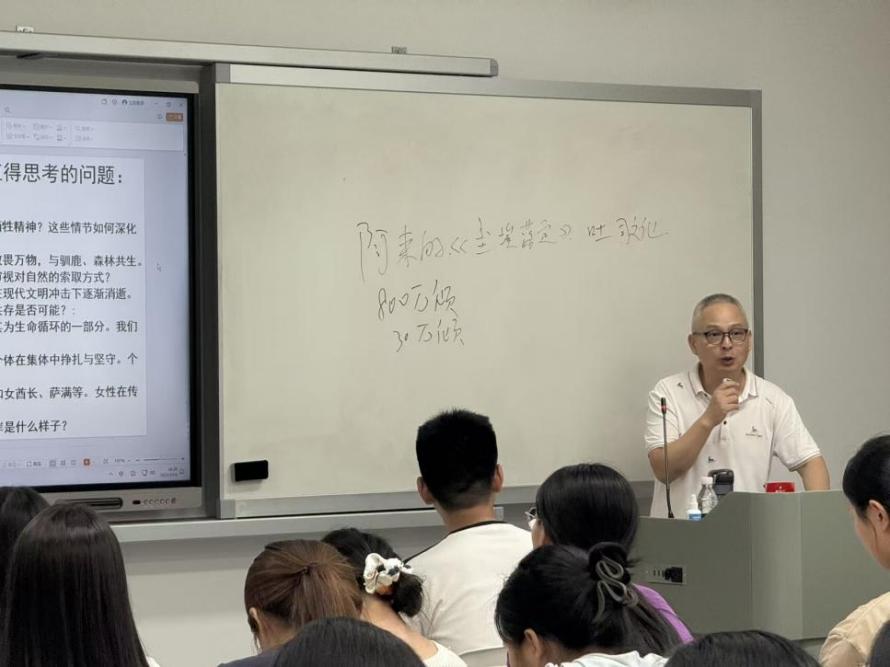 在领读环节中,胡林聚焦于书中“万物有灵的宇宙观”“萨满教的生死哲学”与“游牧思维的现代启示”三个核心维度,引导读者重新思考人与自然、传统与现代、个体与集体之间的关系。他指出,这部作品不仅展现了鄂温克民族百年来的生存图景与文化精神,更以其质朴而诗意的叙事,映照出现代文明发展中值得反思的诸多议题。胡林认为,这一古老民族在传统与现代碰撞中所面临的选择,实则也是对当代人价值观与生活方式的反思。他借此引导同学们共同思考人与万物共处的智慧,以及在社会快速发展中如何守护精神家园。