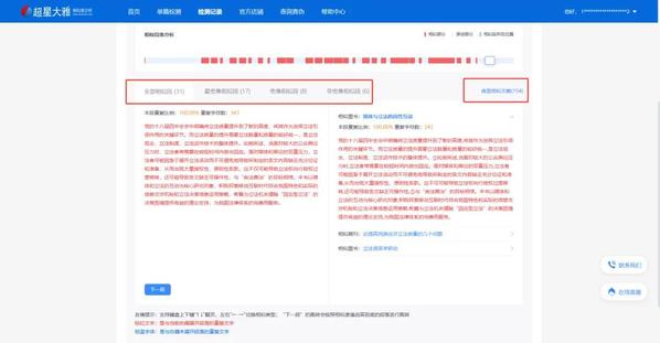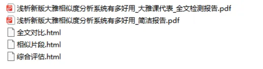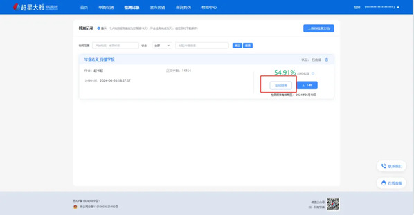 上传成功后系统自动跳转到检测记录页面,在检测记录中找到自己需要的检测记录,点击“下载”,或者点击在线报告后点击“下载报告”即可下载报告包。可下载的报告包包括:全文检测报告pdf简洁报告pdf全文比对、相似片段、综合评估html
