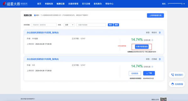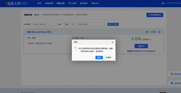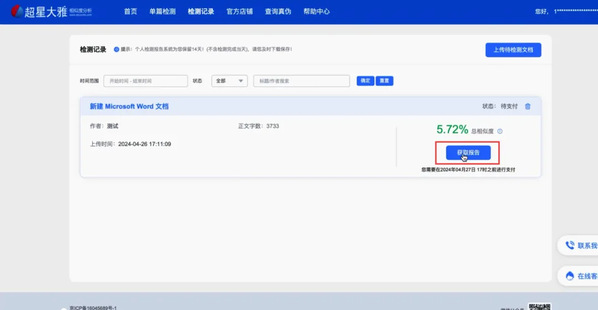 上传成功后系统自动跳转到检测记录页面,在检测记录中找到自己需要的检测记录,点击“获取报告”,将会提示您使用单位的免费权限来获取报告,如果3次免费权限使用完毕后则需要自行付费。