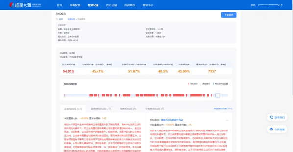 通过“在线报告”进入到所上传文献的网页报告页面,了解文献相似度等情况。通过分布条直观反映相似的段落或语句在全文中的分布情况。