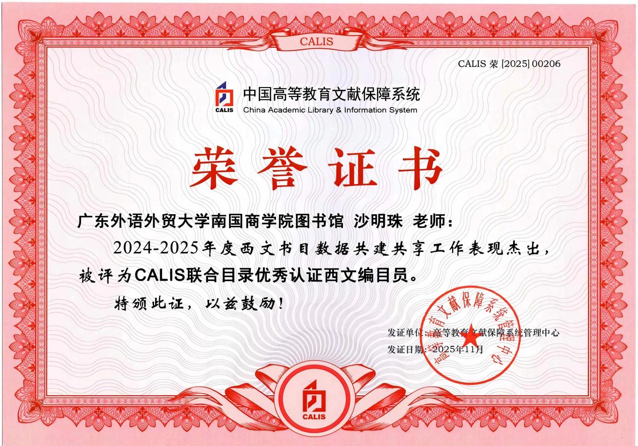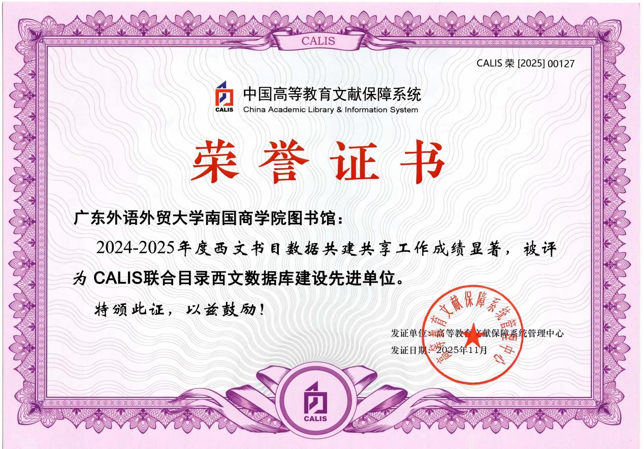 近年来,图书馆紧密围绕学校“外语+专业”的办学特色,系统推进外语文献资源体系化建设,持续优化编目队伍,严格把控数据质量,确保提交的每一条数据均符合国家标准。此次获奖,是国家层面对我馆资源建设专业化水准的高度认可,也是我校西文文献资源建设与服务能力迈入全国先进行列的有力证明。