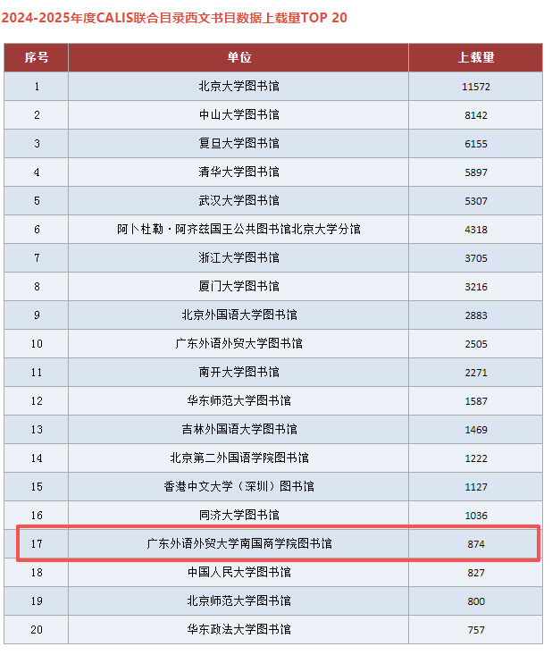 此次上榜标志着我校在外语文献资源建设方面取得重大进步,不仅超越了多所传统公办外语类院校,更体现出我校在西文资源组织与共享方面的领先水平。作为CALIS成员馆,我校上传的高质量书目数据已进入全国联合目录数据库,全国高校读者均可检索并下载使用,这有力促进了资源的共建共享,进一步提升了我校在全国高校图书馆体系中的学术贡献度与行业影响力。