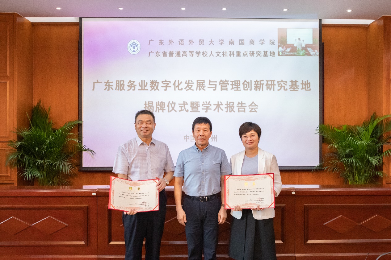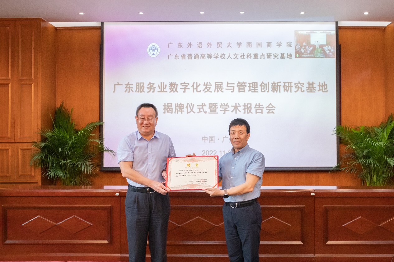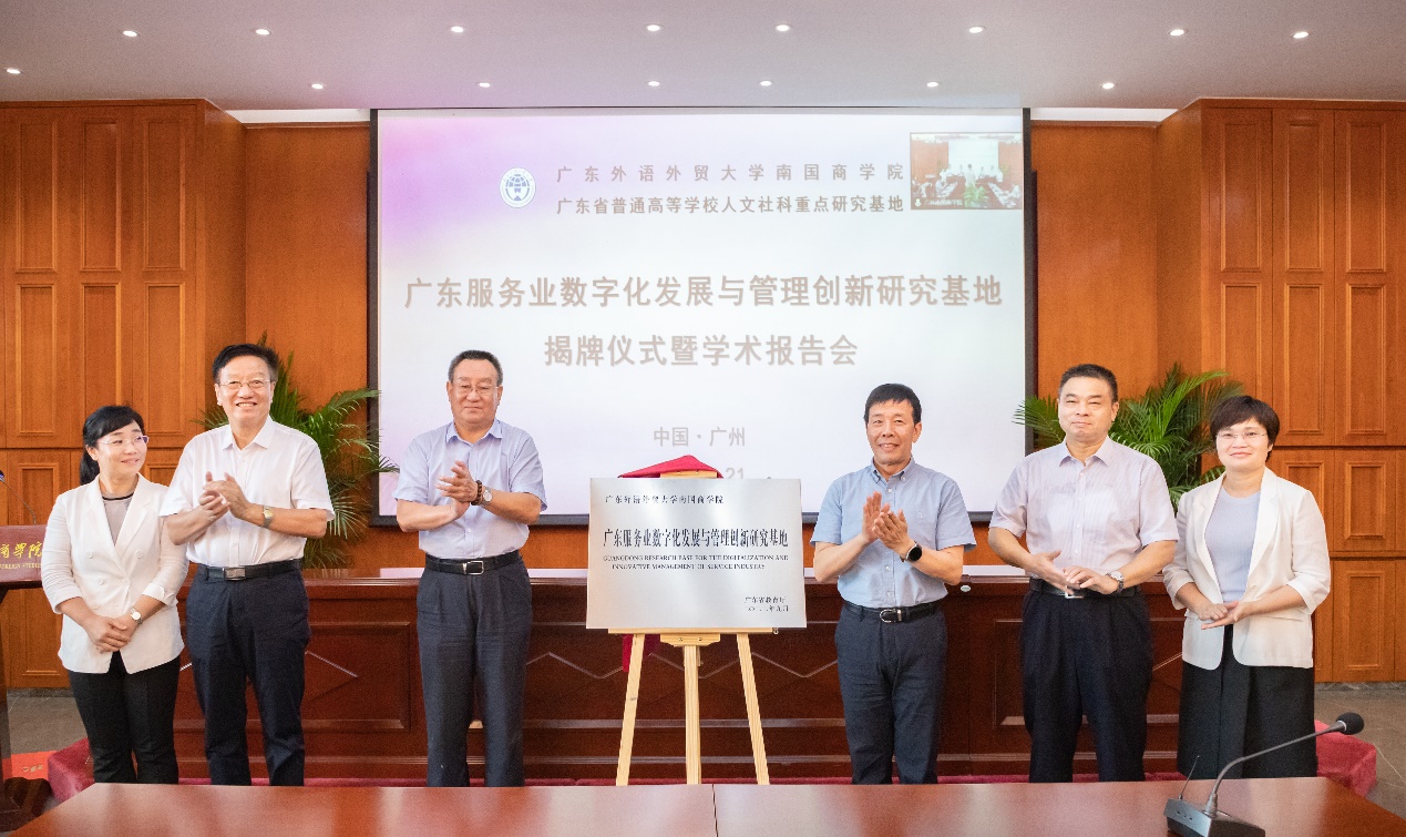 11月21日,广东服务业数字化发展与管理创新研究基地(以下简称“基地”)揭牌仪式暨学术报告会在国际会议厅顺利举办。会议采取线上线下相结合的方式进行,服务业数字化发展与管理创新领域的专家学者、企业家、科研处、经济学院、计算机学院、数字科学与技术研究院等部门负责人以及管理学院全体教师参加了会议。学校执行校长王华、督学顾也力、副校长赵福春出席会议。