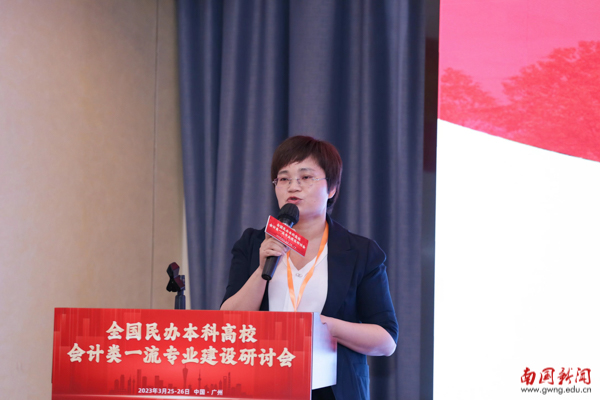 26日上午,基地常务副主任文佑云以“思政引领、技术赋能、三色发展——广外南国商学院会计学专业建设实践”为主题,向全国同行介绍了广外南国商学院会计学国一流专业的建设思路、建设举措、建设成效、困难与努力方向。广外南国商学院以新文科建设为指引,以国家级一流专业项目申报书和建设方案为依据,结合学校办学资源、发展特色和专业建设目标,提出了“思政引领、技术赋能、三色发展”的会计学国一流专业建设的基本思路即坚持立德树人根本任务,紧跟新一轮科技革命和产业变革新趋势,结合学校的外语优势,构建“专业+外语+技术”的人才培养方案,深化教育教学改革,做强应用型底色,突出外语特色,彰显国际化亮色。培养专业基础扎实,外语应用能力的实践能力“双突出”的高素质会计人才。