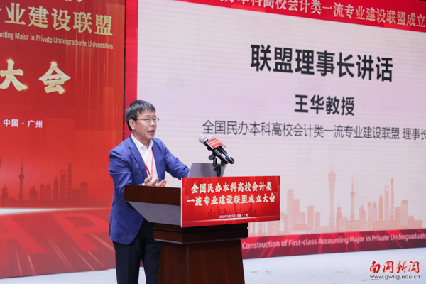 会上,王华以联盟理事长的身份发表讲话。他指出,全国民办本科高校会计类一流专业建设联盟的成立,具有十分重大的意义首先,习近平总书记在党的二十大报告中指出,高质量发展是全面建设社会主义现代化国家的首要任务高质量发展和服务中国现代化已经成为新时代会计学专业发展的一个主题,值得共同研究二是大数据云计算、区块链等新兴技术对于数据的处理方面展现出了极大的优势,尤其是人工智能对会计行业以及会计人员产生了巨大的冲击与挑战,因此,社会对会计人员的要求正在进一步的深化,怎样才能在人工智能的大环境中脱颖而出,变得不可替代,已经成为当代会计人员亟待解决的问题;三是服务区域和地方经济社会发展是民办高校的主要任务,该任务下对会计人才培养及其模式提出了新的要求,高校如何紧紧围绕国家和地方重大发展战略布局做好服务工作,充分发挥学科和人才优势,制定最优方案,不断提高服务区域和地方经济发展的水平,成为新的课题;四是国家级一流本科专业建设是在“四新建设”“以本为本”“破五维”等教育政策调整背景下提出的。各高校在国一流本科专业建设中如何体现专业特色、高效执行建设方案、优化调整人才培养方案、产出标志性成果等问题需要广大同行共同探讨。鉴于此,全国民办本科高校会计类一流专业建设联盟应运而生,希望联盟所属院校能坚守立德树人初心使命,坚持高质量标准,齐心戮力、和衷共济,打造特色鲜明的“民一流”会计类专业发展平台,为中国会计教育发展贡献力量。