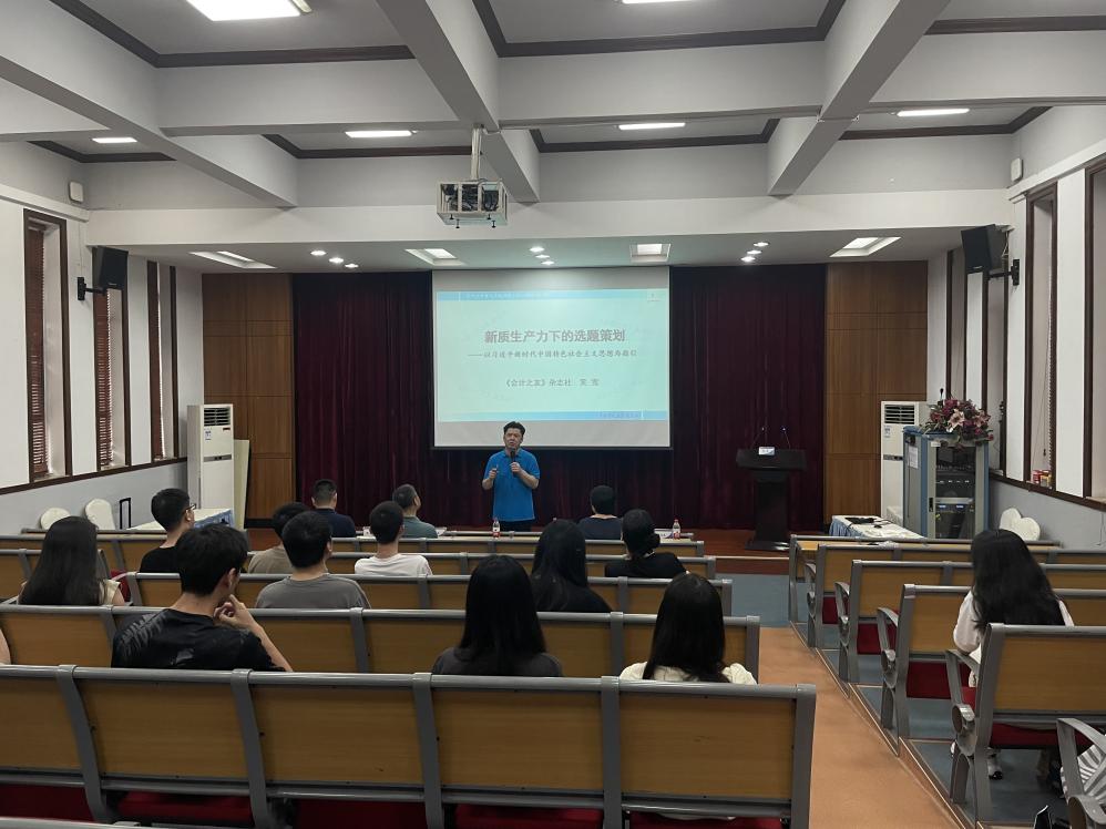 讲座中,笑雪以2016年5月17日习近平总书记的讲话精神中“构建中国特色哲学社会科学的思路”和白居易的“文章合为时而著,歌诗合为事而作”诗句引出本次讲座的主题。接着,他带领师生学习习近平总书记的文化思想以及2024年全国两会精神,结合实际案例,分析了理论研究的路径、高质量论文选题途径和新质生产力相关选题,并指出高质量的科研论文选题,一定要顶天立地(顶天:就是要紧跟和引领会计理论发展新趋势;立地:就是要立足中国实际,诠释和解决中国实际问题。)。此外,笑雪还向师生介绍了十大会计关键词、十大审计关键词、十大热点选题、十大品牌栏目等内容。