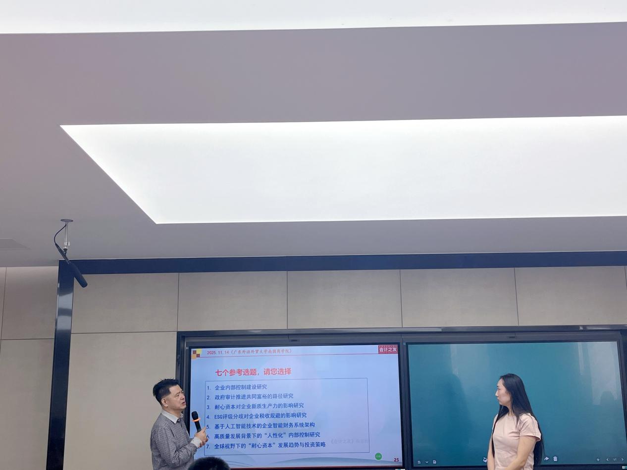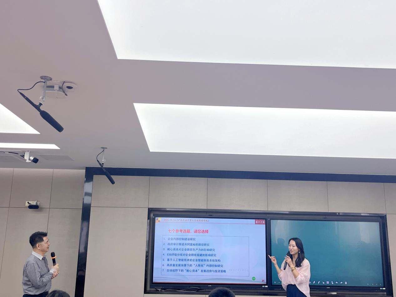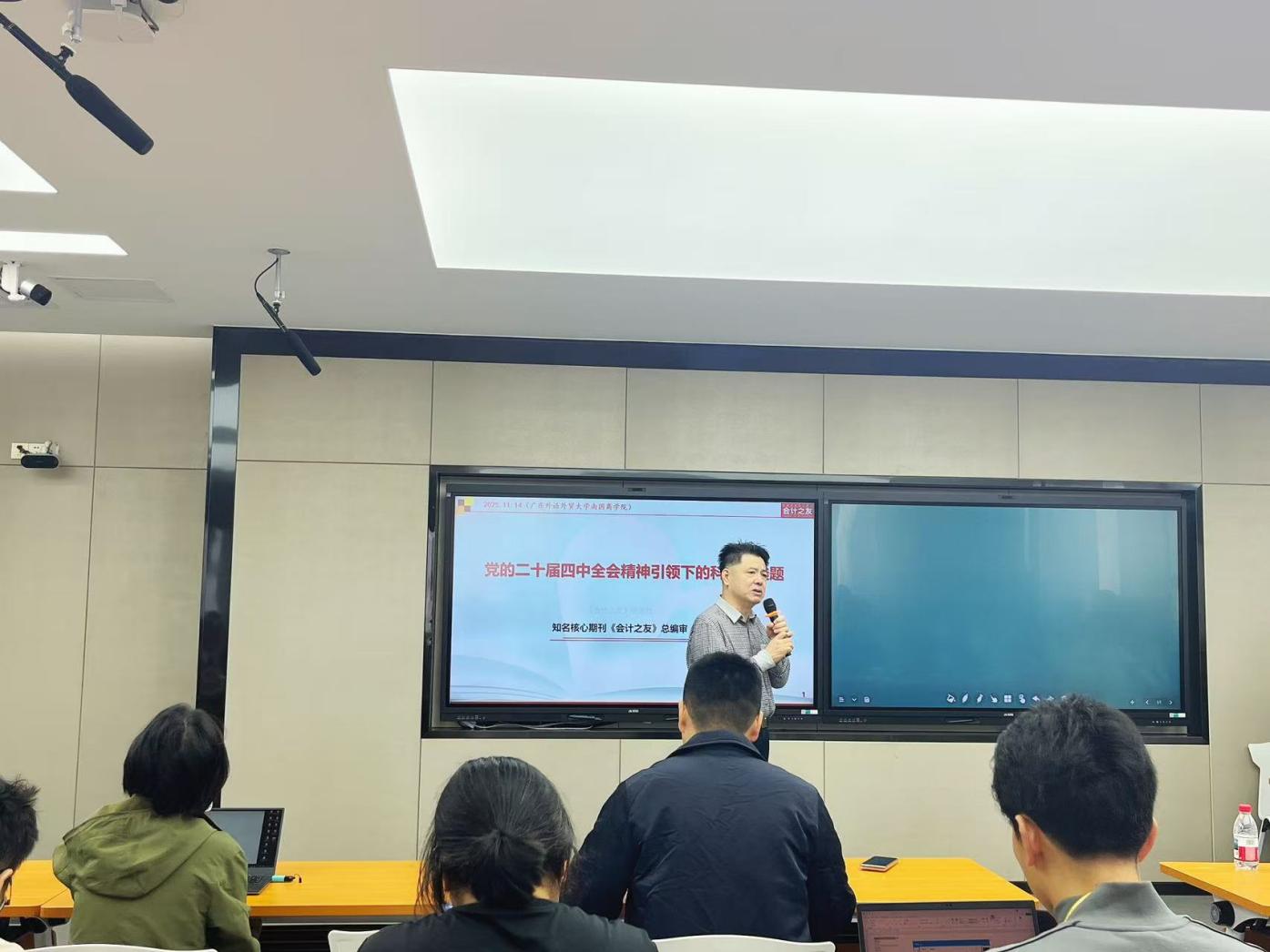 讲座中,笑雪总编审紧扣党的二十届四中全会核心精神,解读了高质量发展、科技自立自强、新质生产力、共同富裕等关键政策导向,强调科研选题需立足时代需求,紧扣教育强国、科技强国、人才强国建设战略。他结合自身办刊经验,提出选题应遵循“新、真、好”标准,推荐了数据资产、零基预算、耐心资本、中国自主会计知识体系等前沿方向,同时提醒师生避开选题过大、过旧、及不适宜的研究方向税收筹划等不适宜选题。