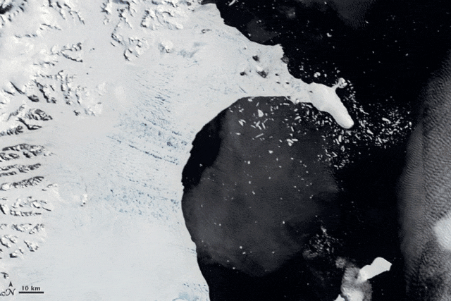 在南极半岛的脊梁上有一座两侧都矗立着冰架的冰川山脉。2002年初,Terra卫星上的MODIS仪器监测到其中一个冰架崩塌并逐渐消失,这一观测结果为科学家们提供了冰川动态变化的第一手资料。2014年期间,拉森B冰架经历了一次前所未有的大规模融化事件。1月,表面上一块面积为1250平方英里的冰层融化成了海水,约为1.4个海南岛。到了2月中旬,冰架的前缘已经后退了约6英里,大冰山正在剥落并漂向大海。3月7日,冰架完全消失。