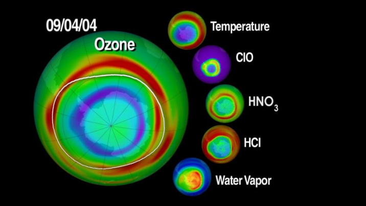 大气中不同高度的气体分子借助特别的仪器才能探测到。从轨道上看,地球的气体分布如图片上所示,表现为一系列层次分明的圈层结构。在众多卫星平台中,只有Aura卫星上的“微波支臂探测仪”才能获得大气层的侧视图,它是第一个从太空测量臭氧消耗循环的仪器。通过气体分布进行分析,科学家能够精确地逐层测量大气化学成分,监测臭氧层空洞的气体和评估云层对气候变化的影响。