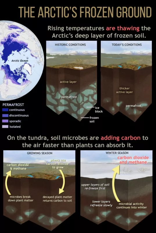全面评估北极变暖的生态效应,必须深究其对永久冻土的影响。永久冻土是指温度至少保持在水的冰点0°C或以下,且持续时间为两年或以上的地面。当前北极加速变暖正在瓦解这一脆弱的温度平衡,深度达数十米的冻土层开始解冻,释放出封存在永久冻土中的有机碳。这一过程犹如打开潘多拉魔盒,触发一系列连锁反应: