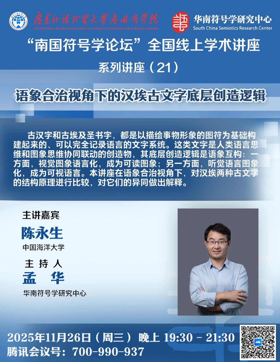 古汉字和古埃及圣书字,都是以描绘事物形象的图符为基础构建起来的、可以完全记录语言的文字系统。这类文字是人类语言思维和图象思维协同联动的创造物,其底层创造逻辑是语象互构:一方面,视觉图象语言化,成为可读图象;另一方面,听觉语言图象化,成为可视语言。本讲座在语象合治视角下,对汉埃两种古文字的结构原理进行比较,对它们的异同做出解释。