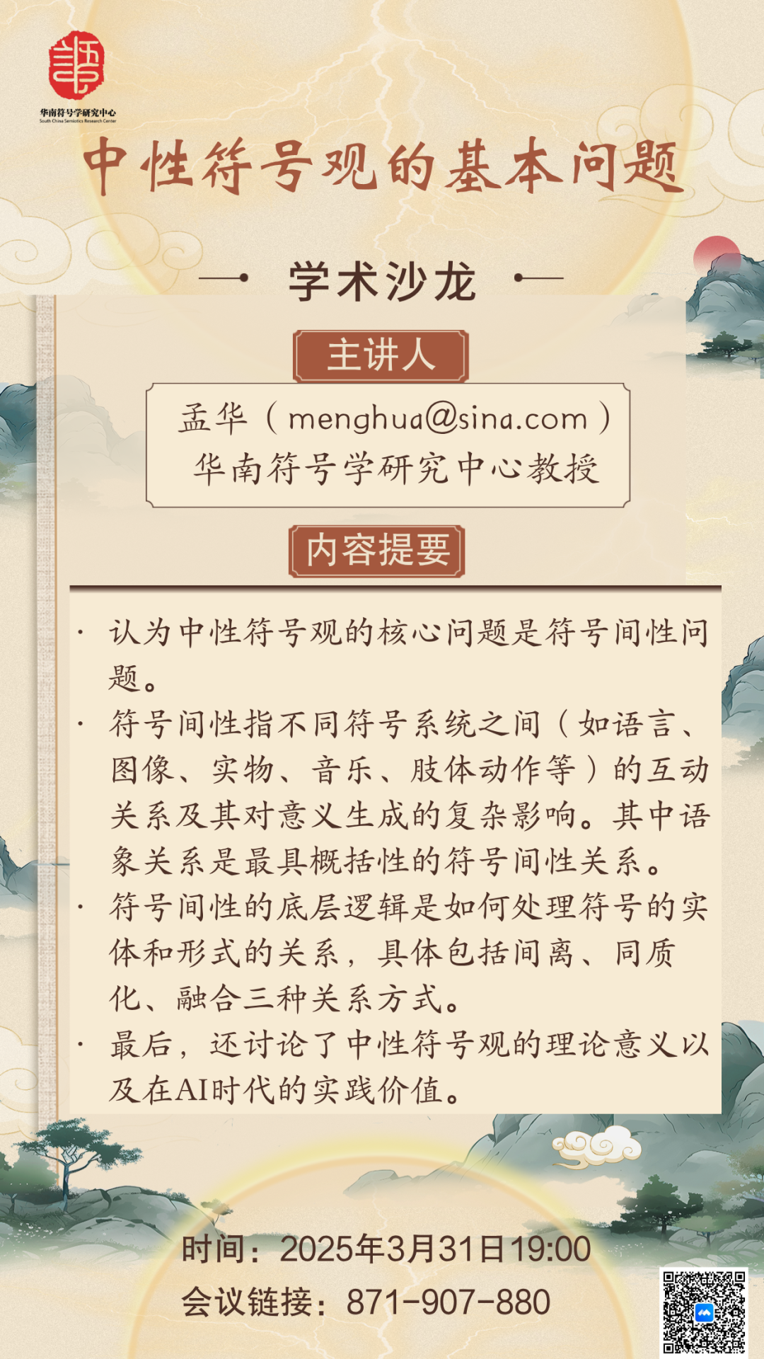 华南符号学研究中心将于2025年3月31日(星期一)19:00——21:00举办一场题为《中性符号观的基本问题》的学术沙龙,由华南符号学研究中心孟华教授主讲。本次沙龙将在腾讯会议举行,参会号码为871-907-880,欢迎各位师友前来聆听、互动!