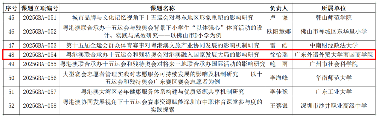 此外,在广东省社会科学界联合会发布的“十五运会和残特奥会粤港澳协同发展理论与实践研究课题”立项名单中,徐怡瑞主持的《粤港澳联合承办十五运和残特奥会对港澳融入国家发展大局的影响研究》也成功入选。该课题紧扣国家重大体育赛事,致力于为粤港澳协同发展提供理论支撑和对策建议。