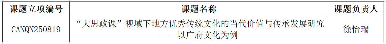 在中国民办教育协会公布的《2025年度规划课题(青年课题)立项名单》中,徐老师主持申报的《“大思政课”视域下地方优秀传统文化的当代价值与传承发展研究——以广府文化为例》成功获批。该课题立足地域文化特色,积极探索传统文化融入思政教育的创新路径。