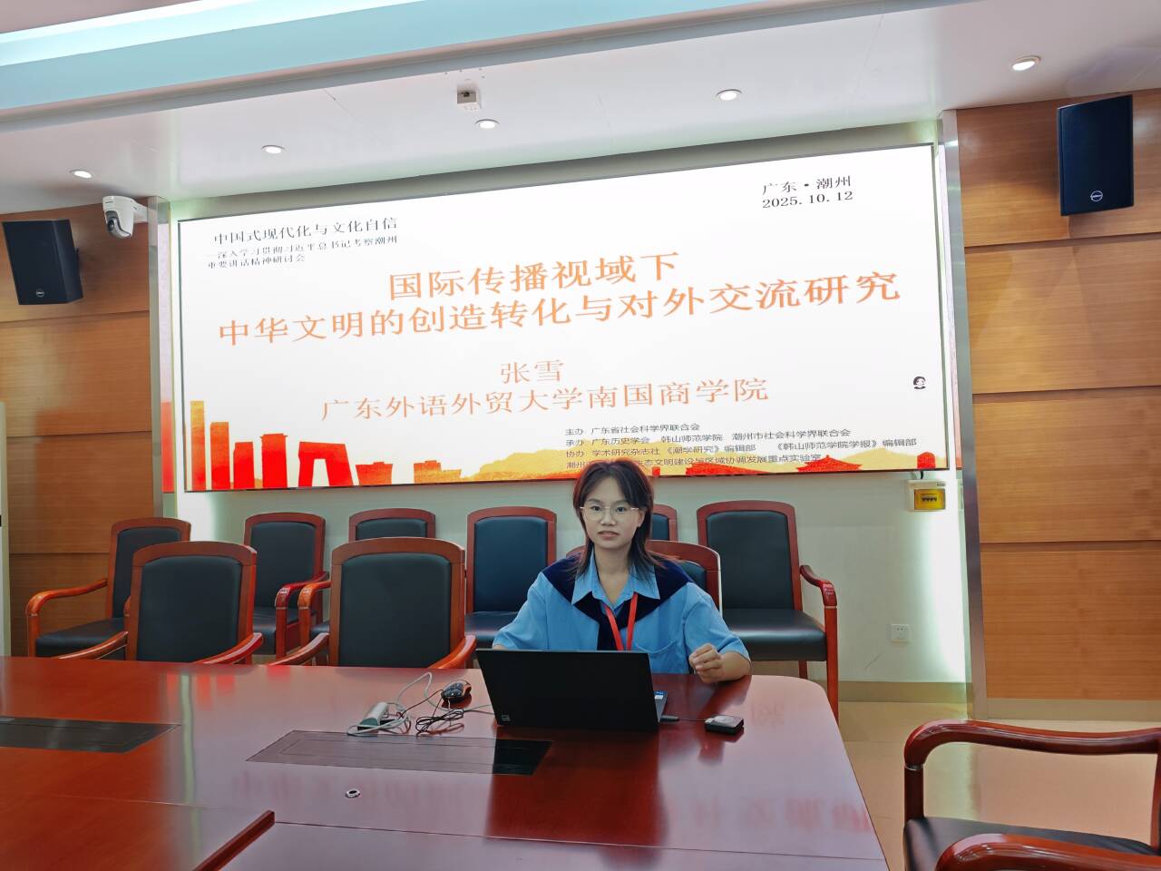 为深入贯彻落实习近平文化思想,深刻把握中国式现代化的文化底蕴,10月12日,由广东省社会科学界联合会主办的“中国式现代化与文化自信”学术研讨会在潮州韩山师范学院举行。本次研讨会汇聚了全国40余家单位的百余位知名学者,我院直属党支部教师党员张雪应邀出席,并在“习近平文化思想研究”专题会场作主题发言,展现了我院在相关领域的学术关注与探索。