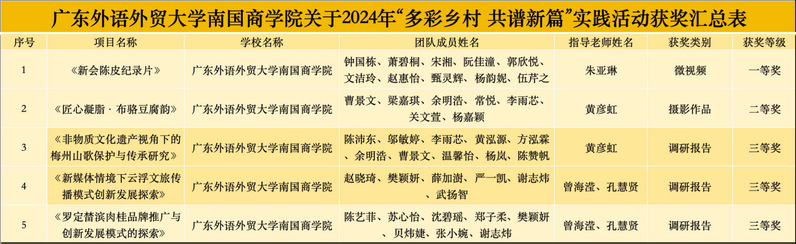 近日,在2024年广东省“多彩乡村 共谱新篇”系列实践活动中,我校师生创作的5件作品分获微视频、调研报告及摄影作品三大类奖项。其中,微视频《新会陈皮纪录片》荣获一等奖,该作品聚焦国家级非遗新会陈皮文化;摄影作品《匠心凝脂·布骆豆腐韵》获二等奖;另有3篇调研报告《新媒体情境下云浮文旅传播模式创新发展探索》《罗定榃滨肉桂品牌推广与创新发展模式的探索》《非物质文化遗产视角下的梅州山歌保护与传承研究》分别获三等奖。