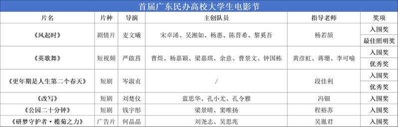 本网讯 近日,首届广东民办高校大学生电影节颁奖盛典在广东亚视演艺职业学院举行,我校学子创作的三部作品获奖。其中,《风起时》摘得最佳照明奖,《更年期是第二个春天》与《英歌舞》分获短剧及短视频单元优秀奖,充分彰显了我校影视传媒教育的丰硕成果和学生卓越的创作实力。